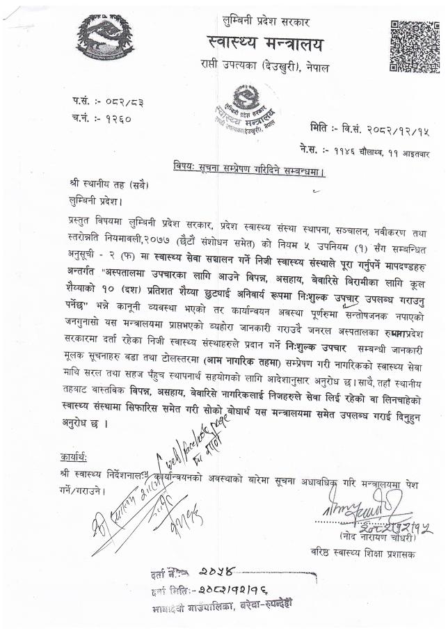 स्वास्थ्य सेवा स्चालन गर्ने निजी स्वास्थ्य संस्थाले पूरा गर्नुपर्ने मापदण्ड सम्बन्धी लुम्बिनी प्रदेश सरकार, स्वास्थ्य मन्त्रालय, राप्ती उपत्यका (देउखुरी), नेपालको सूचना !!!