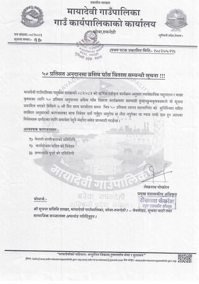 ५० प्रतिशत अनुदानमा ब्रसिम घाँस वितरण सम्बन्धी सूचना !!!