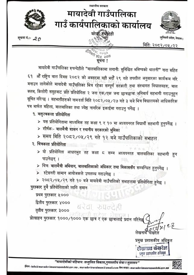 ६१ औं राष्ट्रिय बाल दिवस २०८२ को अवसरमा २०८२ साल भदौ २९ गते आयोजना हुने कार्यक्रम सम्बन्धी सूचना !!! (सम्पूर्ण सामुदायिक तथा संस्थागत विद्यालयहरु, बाल क्लब, किशोरी समूह)