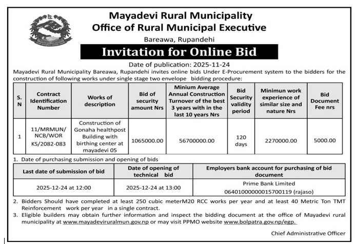 » INVITATION FOR ONLINE BIDS (DATE OF PUBLICATION: 2025-11-24) - MAYADEVI RURAL MUNICIPATLITY, BAREWA-RUPANDEHI.