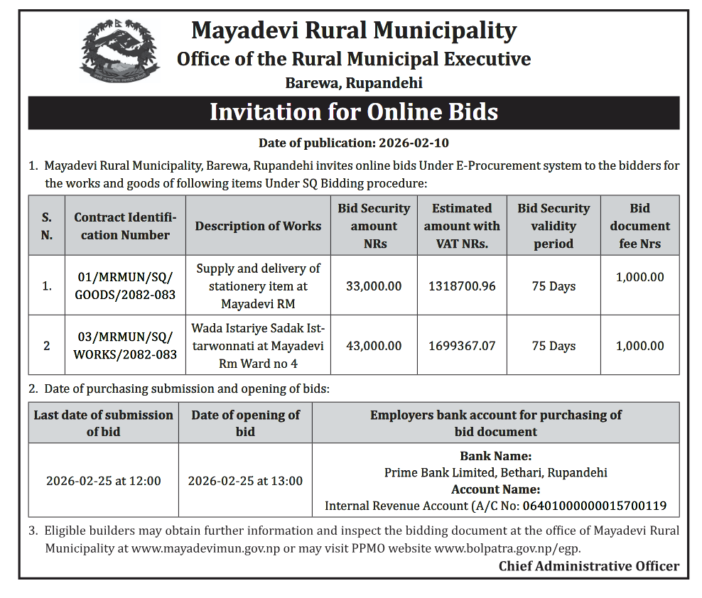 INVITATIONS FOR ONLINE BIDS (D.O.P. 2026-02-10) - MAYADEVI RURAL MUNICIPALITY, BAREWA, RUPANDEHI .