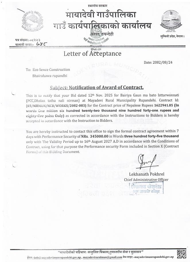 LETTER OF ACCEPTANCE - BAGESHWARDHAM CONSTRUCTION GAIDAHAWA RM-01, RUPANDEHI .