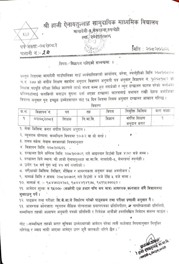 विज्ञापन गरिएको सम्बन्धमा - श्री हाजी ऐनायतुल्लाह सामुदायिक माध्यमिक विद्यालय, मायादेवी-५, सेमरहना, रुपन्देही !!!