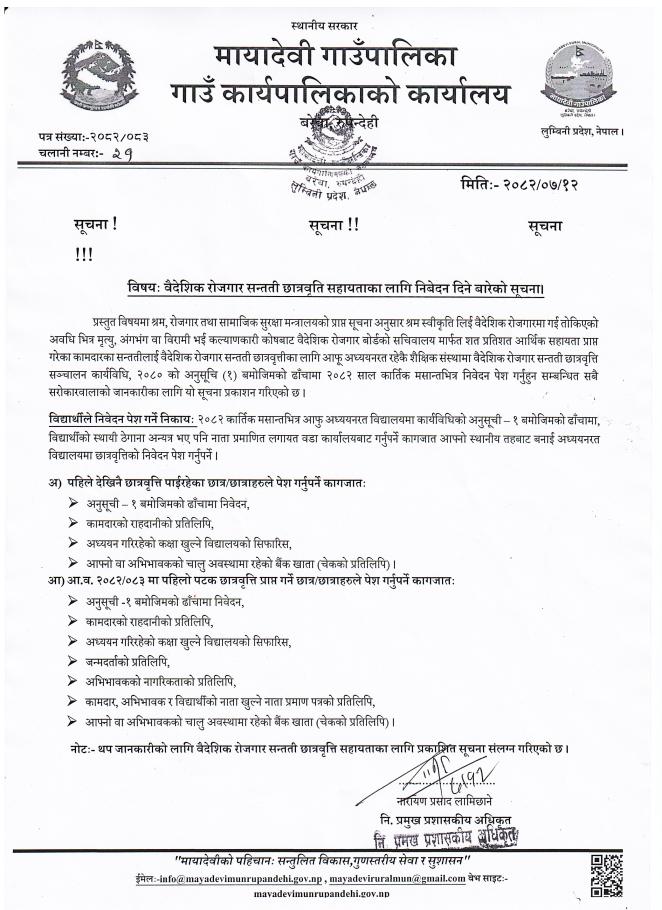 » वैदेशिक रोजगार सन्तती छात्रवृति सहायताका लागि निबेदन दिने बारेको सूचना - मायादेवी गाउँपालिका, बरेवा-रुपन्देही ।