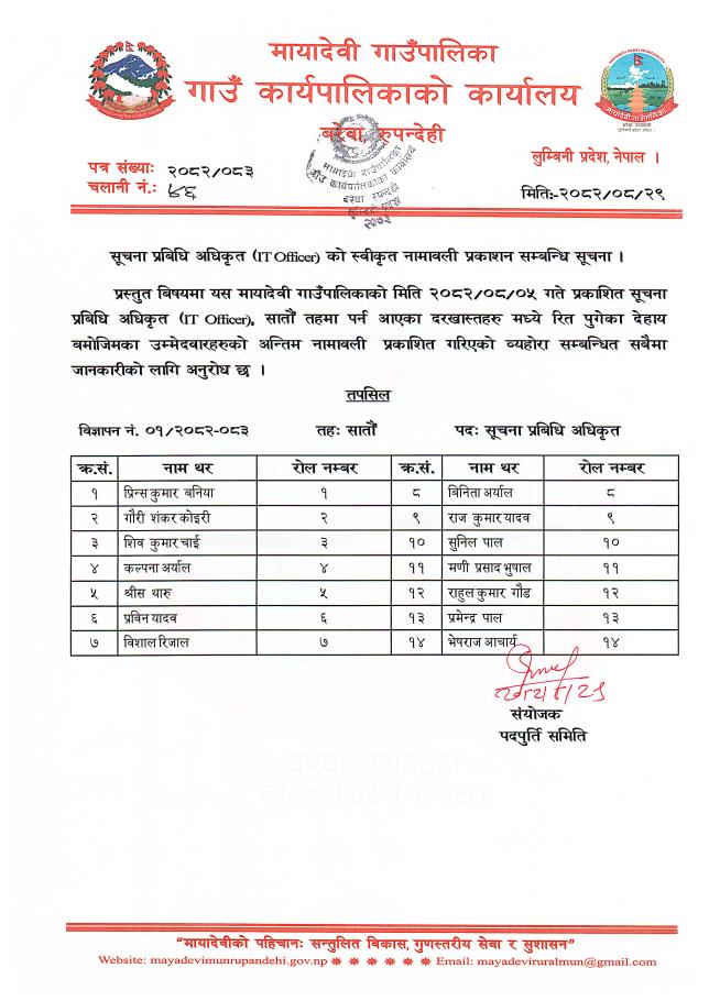 सेवा करारमा सूचना प्रविधि अधिकृत (IT Officer) को स्वीकृत नामावली प्रकाशन सम्बन्धी सूचना - मायादेवी गाउँपालिका, बरेवा-रुपन्देही ।