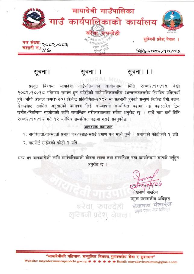 चौथो अध्यक्ष कप (T-२०) क्रिकेट प्रतियोगिता-२०८२ सम्बन्धी सूचना - मायादेवी गाउँपालिका, बरेवा - रुपन्देही ।