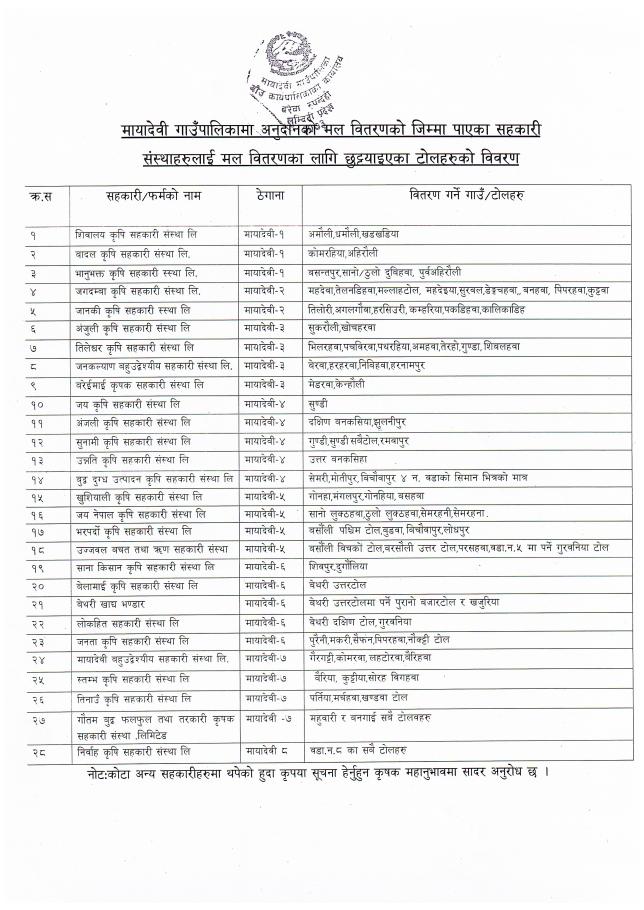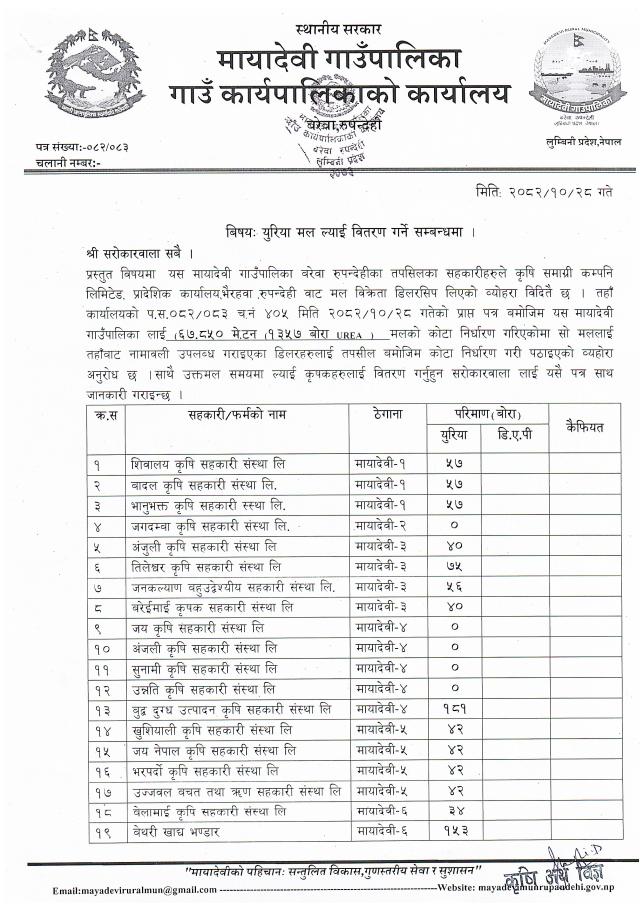 युरिया मल ल्याई वितरण गर्ने सम्बन्धमा - श्री सरोकारवाला सबै, मायादेवी गाउँपालिका, बरेवा-रुपन्देही ।