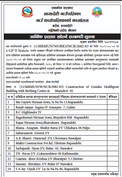 आर्थिक प्रस्ताव खोल्ने सम्बन्धी सूचना - मायादेवी गाउँपालिका, बरेवा-रुपन्देही ।