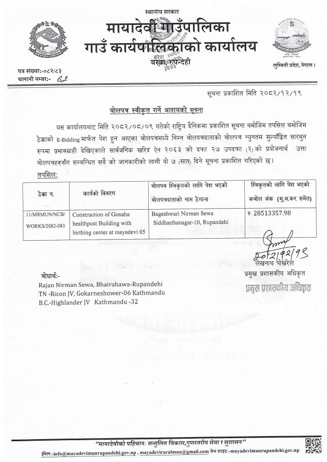 बोलपत्र स्विकृत गर्ने आशयको सूचना - मायादेवी गाउँपालिका, बरेवा-रुपन्देही ।