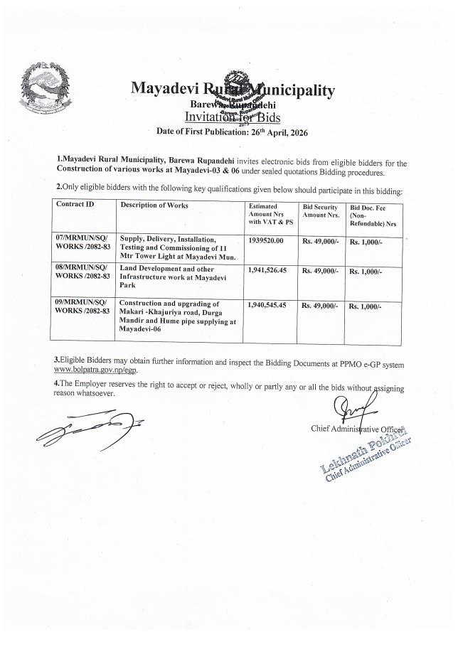 » INVITATION FOR BIDS (D.O.S.B. 26TH APRIL, 2026) - MAYADEVI RURAL MUNICIPALITY, BAREWA, RUPANDEHI.