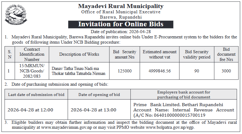 INVITATION FOR BIDS (D.O.S.B. 28TH APRIL, 2026) - MAYADEVI RURAL MUNICIPALITY, BAREWA, RUPANDEHI.
